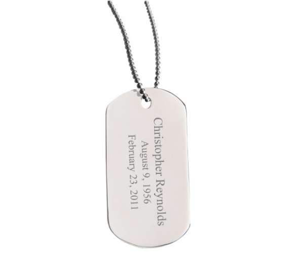Measures 1.13" w x .13" d x 2" h. Stainless steel dog tag. Includes 24" stainless steel beaded chain. Personalization available.